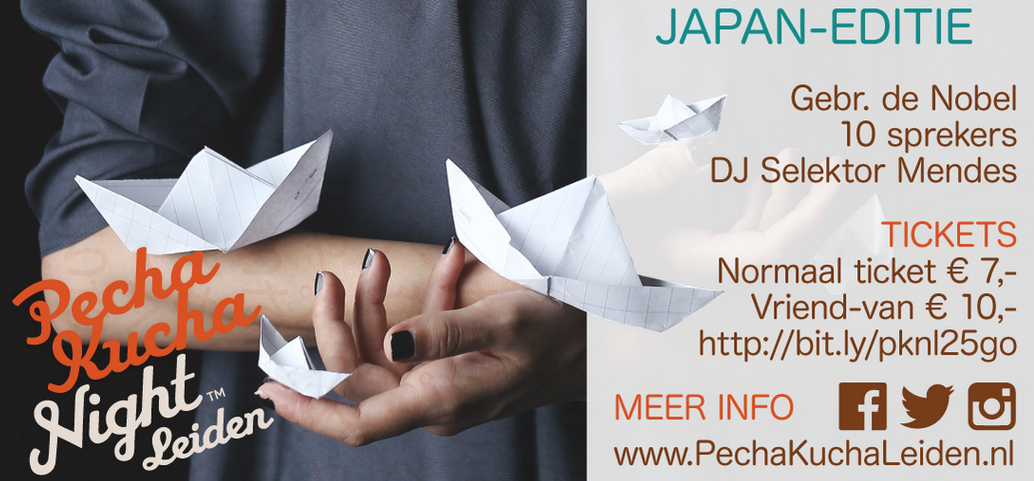 | | PechaKucha | | 7 november 2018 | PechaKucha Night Leiden #25: de Japan-Special brengt op woensdag 7 november een ode aan Japan, de bakermat van PechaKucha. PechaKucha is een presentatievorm waarbij iemand zijn/haar
