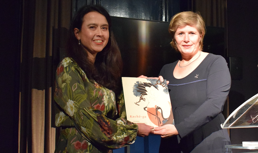 Het eerste exemplaar van de catalogus werd overhandigd aan Yvonne van Delft, wethouder Werk, Inkomen, Economie & Cultuur (rechts op de foto). De gasten genoten van de Japanse kijk op de natuur. Benieuwd naar deze nieuwe tentoonstelling? Hij is nog t/m 3 maart in Japanmuseum SieboldHuis te zien. | | |