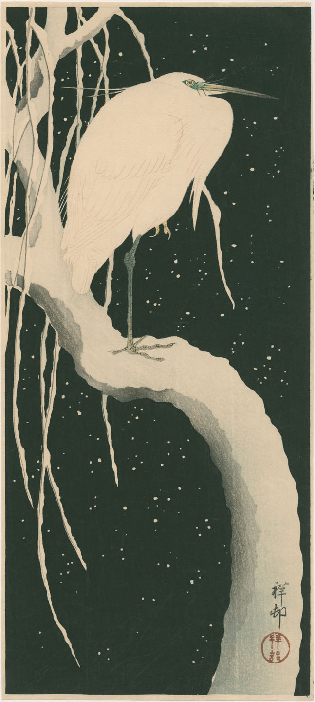 |  | | Zilverreiger op een besneeuwde tak. | Ohara Koson (Shōson) 小原古邨 (祥邨) (1877–1945). 1926, Privécollectie